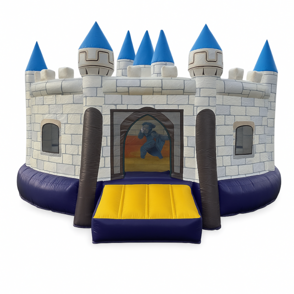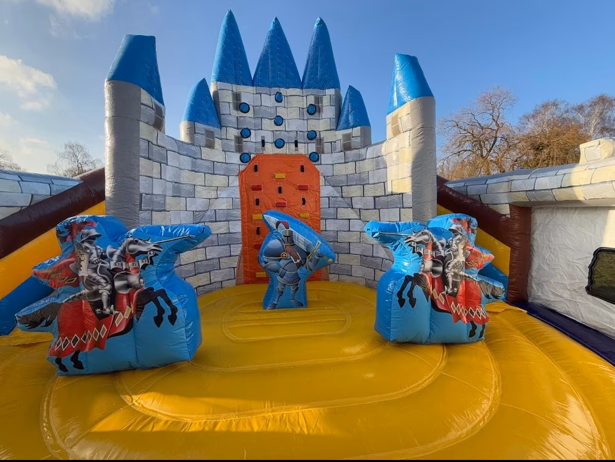 Mieten Sie unsere gigantische Hüpfburg Multiplay Ritterfestung (7,20m x 6,90m x 5,0m) und verwandeln Sie Ihr Event in ein mittelalterliches Abenteuerland für Kinder. Mit integrierter Rutsche, Kletterwand und Spielgeräten ist diese Hüpfburg ein echter Blickfang und sorgt für unvergesslichen Spielspaß.